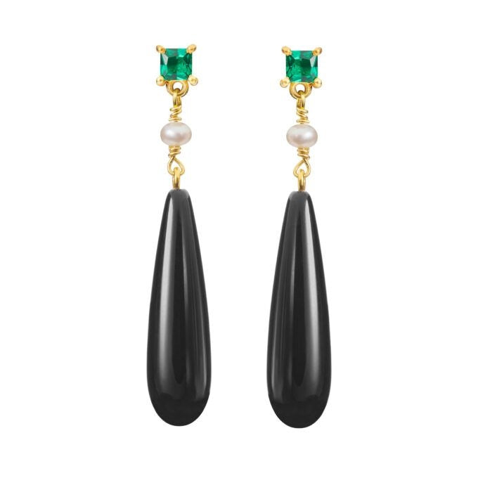 STEN | Dråbeformet Sort agat, Hvid ferskvandsperle og grøn syntetisk kubisk zirkonia |