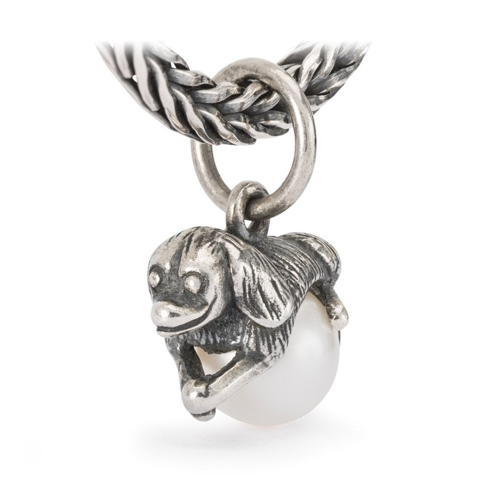 På den runde, hvide perle hviler der en hyggelig hund i sterlingsølv.